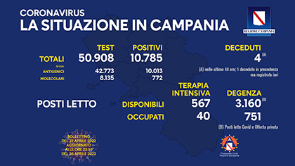 Ecco il report dei posti letto su base regionale: Posti letto di terapia intensiva disponibili: 567; Posti letto di terapia intensiva occupati: 40; Posti letto di degenza disponibili: 3.160 (posti letto Covid e offerta privata); Posti letto di degenza occupati: 751.