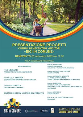 Martedì prossimo, 23 settembre, alle 11.00, nella Sala consiliare della Provincia, alla Rocca dei Rettori, si terrà la conferenza stampa di presentazione dei progetti dei Comuni beneventani vincitori di "Bici in Comune", iniziativa promossa dal Ministro per lo Sport e i Giovani, con il supporto del Dipartimento per lo Sport, per il tramite di Sport e Salute e dell'Anci.