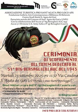 Martedì prossimo, 23 settembre, alle 11.30, in via Caudina a Sant'Agata dei Goti, alla rotonda del nuovo parcheggio, l'Associazione Turistica Pro Sant'Agata Pro loco inaugurerà il totem commemorativo dedicato al 51° Battaglione Bersaglieri, che nel 1943 sostò in città prima di combattere sulla Linea Gustav a Mignano Monte Lungo.