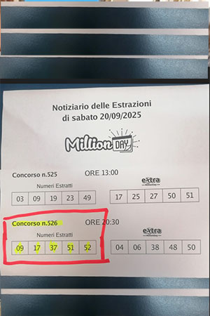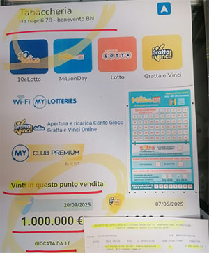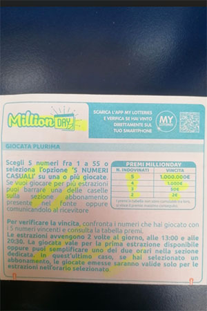 Un giocatore, puntando solo 1 euro al "Milion Day" ha azzeccato tutti i cinque numeri previsti dal concorso a premi ed ha vinto 1 milione di euro.
