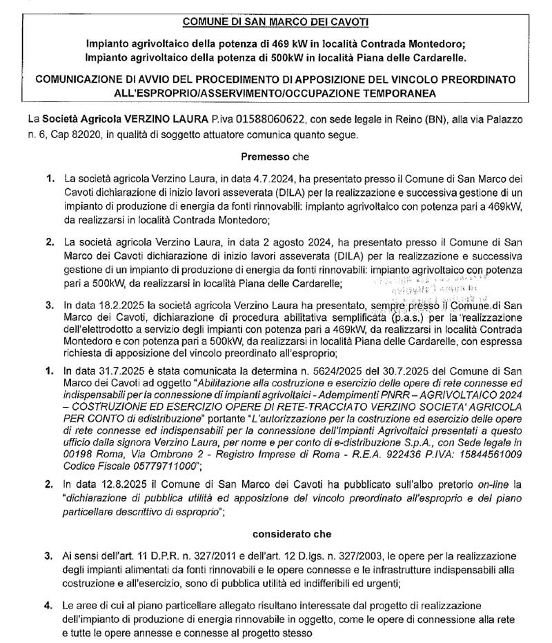 Comune di San Marco dei Cavoti. Impianto agrivoltaico della potenza di 469 kw in localita' contrada Montedoro ed impianto agricoltaico della potenza di 500 kw in localita' Piana delle Cardarelle