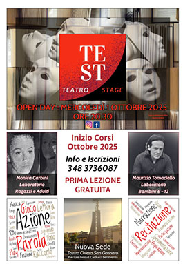 Durante il giorno di apertura, a ingresso libero, verranno svelati i dettagli delle novità in arrivo, specialmente del nuovo corso per bambini dai 6 ai 12 anni che avrà l'onore di pregiarsi della preparazione, della competenza e del talento di un attore e doppiatore sannita, Maurizio Tomaciello, volto teatrale, di cinema e tv, che contestualmente ci sarà anche nelle produzioni di Test Teatro Stage.