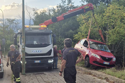 Una Lancia Ypsilon, condotta da una 54enne e' finita in una scarpata ed il pronto intervento della Polizia Municipale ha evitato che scivolasse giu' con il ferito a bordo