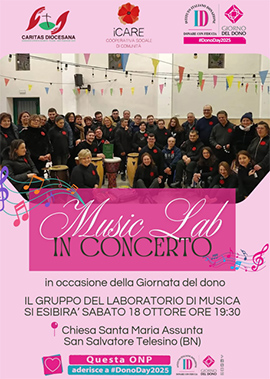 Il concerto dell'orchestra del Laboratorio Musicale, diretta da Marco Rosiello e coordinata dal vicepresidente di iCare Rosaria Vecchi, si svolgerà in occasione della "Giornata del Dono" dell'Istituto Italiano per la Donazione, che vede quest'anno Irpinia Sannio Capitale Italiana del Dono (promossa dal Cesvolab).