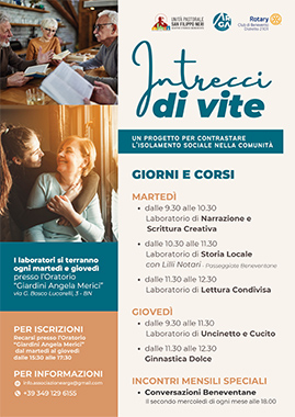 Al via a Benevento, all'Oratorio "Giardini Angela Merici", il progetto "Intrecci di Vite", promosso dall'Associazione Argà - Arte Cultura Sport e Spettacolo in collaborazione con l'Unità Pastorale San Filippo Neri e con il patrocinio del Rotary Club di Benevento.