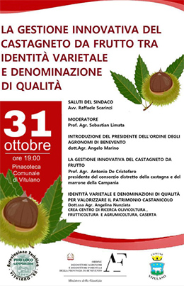 Nell’ambito della XXXII edizione della Sagra della Castagna e del Pecorino Vitulanese, il prossimo 31 ottobre, alle 19.00, nella Pinacoteca Comunale a Vitulano ci sarà il convegno sul tema: "La gestione innovativa del castagneto da frutto tra identità varietale e denominazione di qualità" a cura di Sebastian Limata.