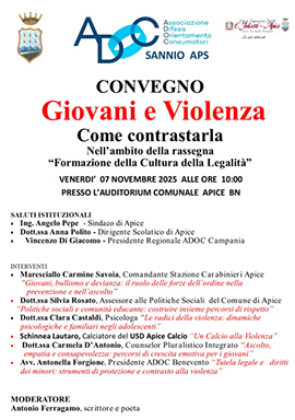 Nell'ambito della rassegna "Formazione della Cultura della Legalità", venerdì prossimo, 7 novembre, alle 10.00, nell'Auditorium Comunale di Apice si terrà il convegno "Giovani e Violenza. Come contrastarla".