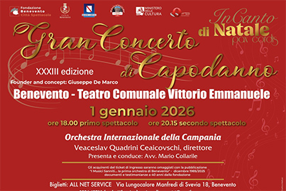Musicainsieme, ente accreditato al Ministero della Cultura (Mic), in collaborazione con la Fondazione Benevento Città Spettacolo e con il patrocinio del Comune di Benevento, ha annunciato la XXXIII edizione del tradizionale "Gran Concerto di Capodanno", uno degli appuntamenti più attesi del panorama culturale campano.