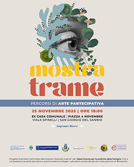 Martedì prossimo, 25 novembre, alle 18.00, l'ex Casa comunale di San Giorgio del Sannio, in piazza IV Novembre, ospiterà una mostra unica che metterà in luce la creatività e le voci dei bambini e dei giovani protagonisti del progetto Tecniche, Risorse, Artistiche, Multidisciplinari ed Educative (Trame), finanziato nell'ambito di "Educare insieme" del Dipartimento per le politiche della famiglia, iniziativa che mira a contrastare la povertà educativa ed a promuovere lo sviluppo culturale e sociale dei giovani nella provincia di Benevento.