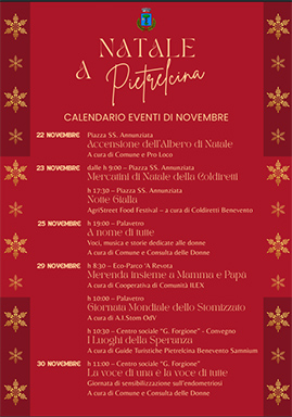 Con l’avvicinarsi delle festività, Pietrelcina si anima d'iniziative che anticipano il Natale, per arricchire un calendario già ricco di appuntamenti nell'anno del Giubileo.