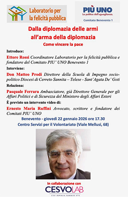 Il Laboratorio per la felicità pubblica e il Comitato "Più uno Benevento 1" hanno organizzato per giovedì prossimo, 22 gennaio, alle 17.30, al Centro Servizi per il Volontariato di Benevento al viale Mellusi, un incontro sul tema: "Dalla diplomazia delle armi all'arma della diplomazia. Come vincere la pace".