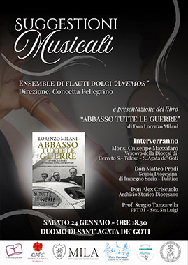 Sabato prossimo, 24 gennaio, alle 18.30, infatti, al Duomo di Sant'Agata dei Goti verrà presentato il libro di don Lorenzo Milani, curato da Sergio Tanzarella della Pontificia Facoltà Teologica dell'Italia Meridionale-Sezione San Luigi di Napoli, intitolato "Abbasso tutte le guerre", in quella che sarà un’atmosfera ricca di emozioni e riflessioni.