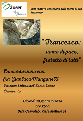 Auser Filo d'Argento, intende offrire, a quanti siano interessati, un momento di riflessione e un invito alla fratellanza valori che appartengono a pieno titolo ai caratteri identitari dell'associazione attraverso l'incontro dal titolo "Francesco: Uomo di pace, fratello di tutti" con fra' Gianluca Manganelli, parroco della chiesa del Sacro Cuore, che si terrà giovedì prossimo, 29 gennaio, alle 17.00, nella Sala Cesvolab al viale Mellusi.