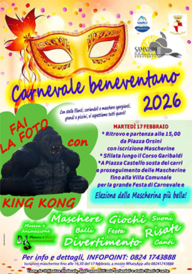 La Pro loco di Benevento "Samnium" presieduta da Pino Petito, con il patrocinio morale del Comune di Benevento, ha organizzato il "Carnevale di Benevento" 2026, in programma martedì prossimo, 17 febbraio, con una sfilata e un pomeriggio interamente dedicata alla festa, alla musica e alla tradizione.