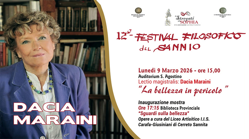 Carmela D'Aronzo, con la sua passione ed entusiasmo, riesce a dare fuoco e vita ad un Festival che e' gia' un elogio della bellezza ha detto l'assessore alla Cultura, Antonella Tartaglia Polcini alla presentazione della XII edizione del Festival Filosofico del Sannio. Dodici appuntamenti a partire dal 9 marzo e fino al 15 maggio