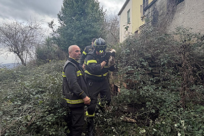Intervento dei Vigili del Fuoco del Comando Provinciale di Benevento a Ceppaloni, in località Barba, per un cagnolino che è stato salvato dopo essere rimasto intrappolato all'interno di un rudere abbandonato.