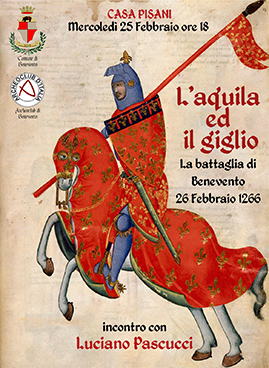 A condurre la conversazione, dal titolo "L'aquila ed il giglio" sarà Luciano Pascucci, che relazionerà sulla famosa battaglia che avvenne qui a Benevento, tra Manfredi di Svevia e Carlo d'Angiò, il 26 febbraio del 1266.