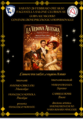 "La Vedova Allegra", ovvero un'illustrazione dell'opera di Franz Lehàr, compositore austriaco di origine ungherese, con guida all'ascolto con evoluzione psicologica dei personaggi, tramite voci e immagini, è lo spettacolo che si svolgerà sabato prossimo, 28 febbraio, al Salone Club House del Circolo "La Fagianella", con inizio alle 18.30.