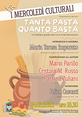 Il prossimo 4 marzo, alle 18.30, la Fondazione Gerardino Romano, nella sede di Telese Terme, ospiterà la presentazione del libro "Tanta pasta quanto basta. Un'allegra guida alla cucina del benessere", edito da Homo Scrivens Editore, 2025.