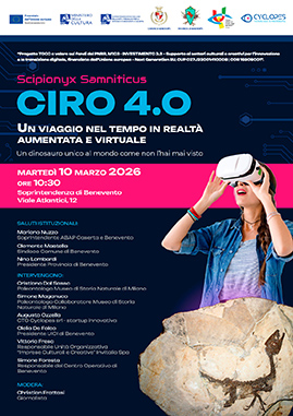 Martedì prossimo, 10 marzo, alle 10.30, nella sede della Soprintendenza Archeologia, Belle Arti e Paesaggio per le province di Benevento e Caserta situata al viale degli Atlantici a Benevento, sarà presentato "Ciro 4.0 - Scipionyx Samniticus. Un viaggio nel tempo in realtà aumentata e virtuale", progetto realizzato nell'ambito del programma Tocc promosso dal Mic e gestito da Invitalia, a valere sui fondi del Pnrr - M1C3, Investimento 3.3, dedicato al supporto dei settori culturali e creativi per l'innovazione e la transizione digitale.