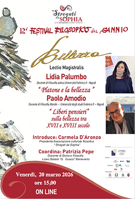 Venerdi prossimo, 20 marzo, alle 15.00, si terrà on-ine il quarto appuntamento del XII Festival Filosofico del Sannio, organizzato dall'associazione culturale filosofica "Stregati da Sophia".