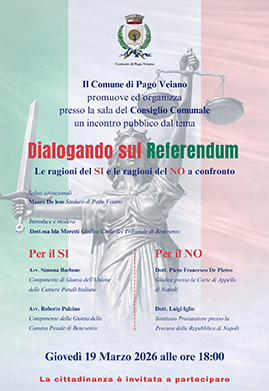 L'Amministrazione comunale di Pago Veiano promuove "Dialogando sul Referendum", un momento di confronto istituzionale per approfondire, in modo equilibrato, le ragioni del Sì e del No sul referendum in materia di ordinamento giurisdizionale.