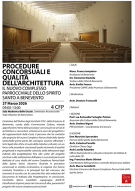 Il prossimo 27 marzo, a partire dalle 9.00, nella Sala Madonna delle Grazie del Seminario Arcivescovile di Benevento, si terrà il convegno "Procedure concorsuali e qualità dell'architettura. Il nuovo complesso parrocchiale dello Spirito Santo a Benevento", promosso dall'Ordine degli Architetti della Provincia di Benevento e curato dalla Commissione Cultura.