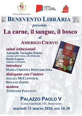 All'interno dell'iniziativa "Benevento Libraria", sarà presentato a Palazzo Paolo V, martedì prossimo, 31 marzo, alle 16.30, l'ultimo libro di Amerigo Ciervo, "La carne, il sangue, il bosco".