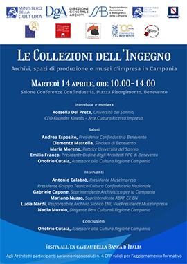 Martedì prossimo, 14 aprile, alle 10.00, nella sede di Confindustria Benevento, in piazza Risorgimento, si svolgerà il convegno "Le Collezioni dell'Ingegno. Archivi, spazi produttivi e musei d’impresa" dedicato al tema della cultura d'impresa tra identità, innovazione e comunicazione, organizzato dall'impresa culturale Kinetès in collaborazione con la stessa Confindustria e con il patrocinio del Ministero della Cultura.