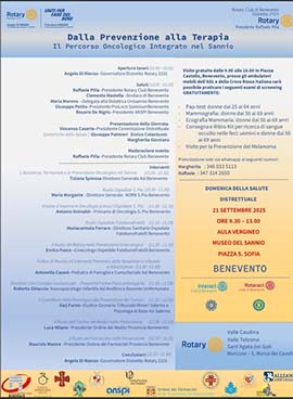 Il Distretto Rotary 2101, guidato dal governatore Angelo Di Rienzo, insieme alla Commissione "Domeniche della Salute" presieduta da Vincenzo Caserta e al Rotary Club di Benevento, presieduto da Raffaele Pilla, ha organizzato l'iniziativa "Dalla Prevenzione alla Terapia - Il Percorso Oncologico Integrato nel Sannio".