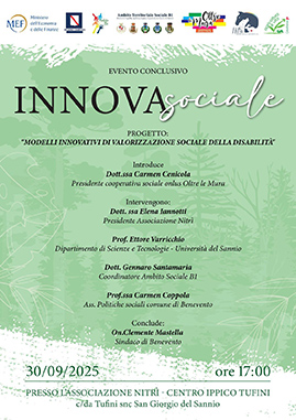 E' in programma martedì prossimo, 30 settembre, con inizio alle 17.00, all'Associazione Nitrì-Centro Ippico Tufini in contrada Tufini a San Giorgio del Sannio, l'evento conclusivo del progetto "InnovaSociale-Modelli innovativi di valorizzazione sociale della disabilità", promosso dall'Ambito Sociale B1 di cui è capofila il Comune di Benevento insieme ai partner Oltre le Mura, Associazione Nitrì, Agricoltura è vita-Cia Campania.