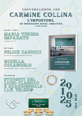 Mercoledì prossimo, 29 ottobre, alle 18.30, la Fondazione Gerardino Romano, nella sede sociale di Telese Terme, ospiterà l'incontro con Carmine Collina per presentare il suo nuovo libro intitolato "L'impostore. Un insegnante senza armatura", Il Seme Bianco 2025.