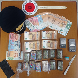 I Carabinieri hanno rinvenuto denaro contante assieme a 13 panetti di hashish, avvolti in cellophane termosaldato, per un peso complessivo di 1,174 chilogrammi e 2,3 grammi di cocaina racchiusi in un piccolo contenitore di vetro