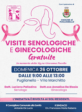 Domenica prossima, 26 ottobre, dalle 9.00 alle 13.00, a Villa Marchitto, si terrà una giornata di visite senologiche e ginecologiche gratuite promossa dall'Associazione Sannio Donna Benevento, con il patrocinio del Comune di Puglianello.