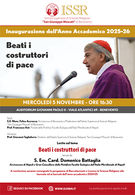 Si terrà mercoledì 5 novembre, alle 16.30, nell'Auditorium del Seminario Arcivescovile al viale degli Atlantici, la cerimonia d'inaugurazione dell'Anno Accademico 2025-2026 dell'Istituto Superiore di Scienze Religiose di Benevento, con la prolusione del cardinale Domenico Battaglia.