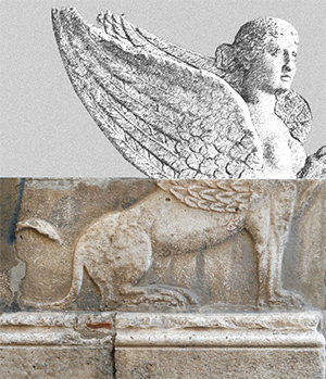 La zampa della Sfinge, invece di dirigersi verso il mitico eroe, potrebbe poggiare su un elemento architettonico o anche su una ruota, come vediamo, ad esempio, in un bassorilievo ritrovato nella chiesa di San Crisogono a Trastevere.