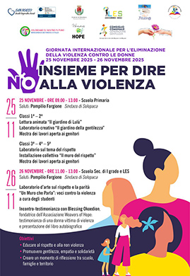 In occasione della Giornata internazionale per l'eliminazione della violenza contro le donne, il Comune e il Sai di Solopaca hanno promosso l'iniziativa "Insieme per dire No alla violenza", un percorso di educazione al rispetto e alla parità che coinvolgerà, nelle giornate di oggi e domani, 25 e 26 novembre, la Scuola Primaria, la Scuola Secondaria di I grado e il Liceo Economico Sociale.