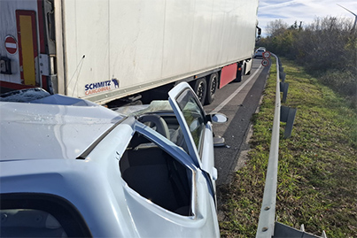 L'auto, il cui controllo è stato evidentemente perso dall'autista, è andata a finire sotto un camion.