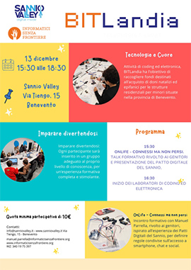 Sabato prossimo, 13 dicembre, alle 15.30, la sede di Sannio Valley, in via Tiengo, a Benevento, ospiterà BitLandia 2025, un laboratorio rivolto a bambini e ragazzi dai 6 anni in su organizzato in collaborazione con Informatici Senza Frontiere (Isf).