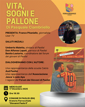 Si terrà mercoledì prossimo, 17 dicembre, alle 18.30, nell'Oratorio "Giovanni Paolo II" di Paolisi, la presentazione del libro "Vita, sogni e pallone" di Pasquale Ciambriello, un racconto autobiografico che intreccia calcio, vita, famiglia e radici.