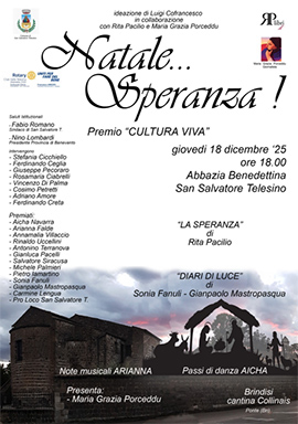 Domani, giovedì 18 dicembre, alle ore 18.00, la suggestiva Abbazia Benedettina di San Salvatore Telesino ospiterà la serata culturale dal titolo “Natale… Speranza”, un evento dedicato alla promozione dei valori della cultura, dell’impegno civile e della sensibilità umana nel territorio sannita.