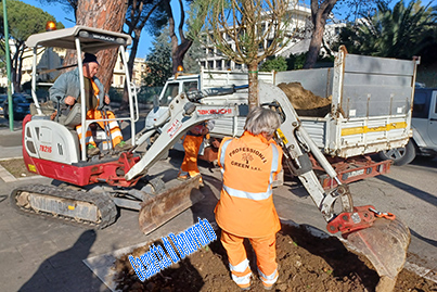 Prosegue la messa a dimora, lungo viale degli Atlantici e poi a via Pacevecchia, dei nuovi alberi di pino in sostituzione di quelli abbattuti in quanto dichiarati pericolosi per la pubblica incolumità.