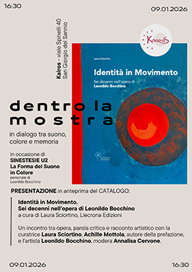 Interverranno la curatrice Laura Sciortino, Achille Mottola, autore della prefazione, e l'artista Leonildo Bocchino, modera Annalisa Cervone.