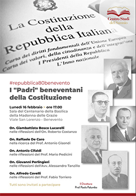 E' il tema dell'incontro organizzato dal Centro Studi del Sannio, nell'ambito della rassegna "Gli 80 anni delle Repubblica", che si terrà il prossimo 16 febbraio, alle 17.00, nella Sala del Centenario Basilica Madonna delle Grazie di viale San Lorenzo.