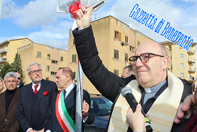 Ultimata la liturgia delle interviste ha avuto inizio la cerimonia che è cominciata con la benedizione da parte dell'arcivescovo mons. Felice Accrocca ed è poi proseguita con lo scoprimento della targa, una targa che, secondo noi è stata scritta finalmente bene, come si deve. Non è stato messo solo il niome dell'intestatario della via, che da solo non dice assolutamente nulla, ma anche la motivazione del riconoscimento ed il periodo a cui si fa riferimento.