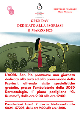 L'Azienda Ospedaliera "San Pio", guidata dal direttore generale Maria Morgante, ha aderito all'Open Day (H) - Onda sulla psoriasi, con servizi gratuiti clinico-diagnostici ed informativi: una iniziativa in collaborazione con Sidemast, la Società Italiana di Dermatologia e Malattie Sessualmente Trasmesse, e con il patrocinio dell'Associazione Psoriasici Italiani Amici della Fondazione Corazza.