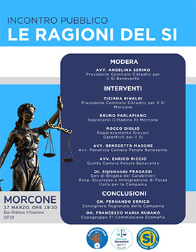 Il dibattito si aprirà con una serie d'interventi di carattere territoriale affidati a: Tiziana Rinaldi, presidente del Comitato Cittadini per il Sì di Morcone; Bruno Parlapiano, segretario cittadino di Forza Italia Morcone; Rocco Diglio, rappresentante dei Giovani Garantisti per il Sì.