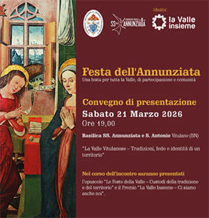 Nel rispetto della tradizione, il prossimo 21 marzo, alle 19.00, Mario Buono, presidente del Comitato Festa della Annunziata, e padre Izaias Rosa da Silvas, guardiano del Convento in Vitulano, nella Basilica dell'Annunziata annunceranno il programma della Festa della Annunziata per il 2026.
