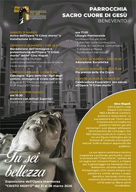 Il Santuario Sacro Cuore di Gesù, parrocchia dei padri Cappuccini di Benevento, ospiterà, dal 21 al 28 marzo prossimi, l'opera marmorea "Cristo Morto" di Gino Rispoli.