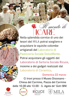 Nella cornice di uno dei tesori inestimabili custoditi dal Museo itinerante dei Luoghi Alfonsiani (Mila), la chiesa del Carmine, a piazza del Carmine, che fa da ingresso al Museo Diocesano, iCare allestirà uno spazio di promozione e vendita, dalle 10.00 alle 13.00, proponendo le colombe artigianali del laboratorio di pasticceria sociale "DolceMente", gli oggetti del Laboratorio di Sartoria Sociale "RiCuce" e i gadget realizzati dal Laboratorio di Ceramica.